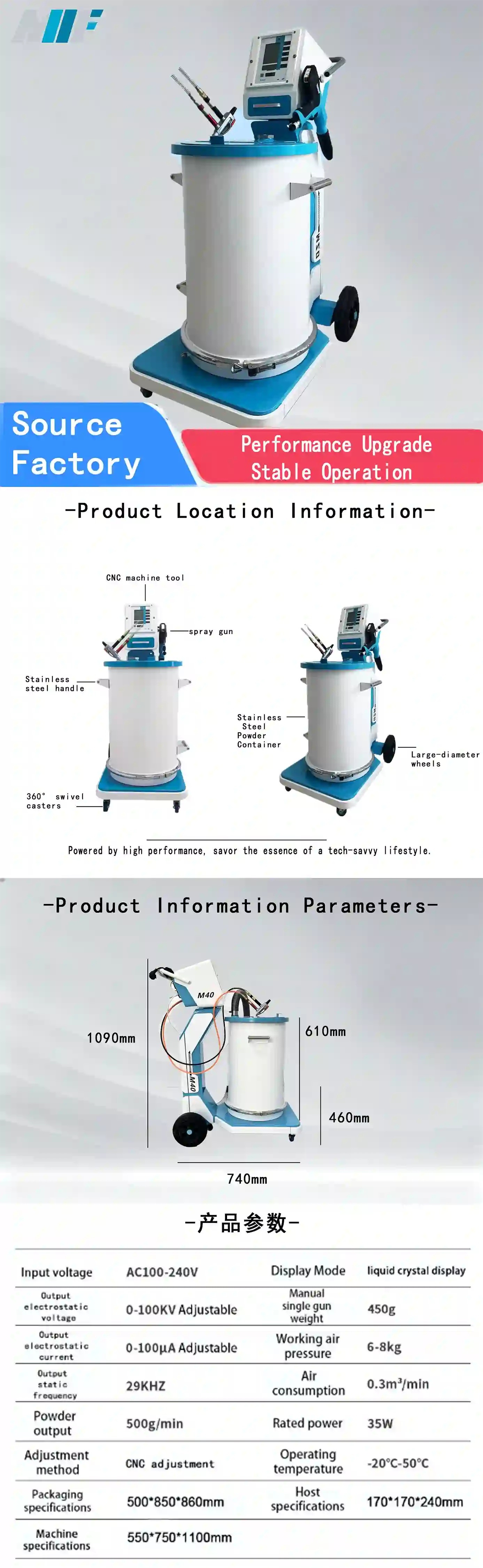 The M40 Auto Spray Gun utilizes advanced turbine drive technology, engineered for demanding industrial environments. It offers superior powder control and exceptional transfer efficiency, making it ideal for heavy coating applications and complex geometries, ensuring reliable, high-quality, and consistent finishes.